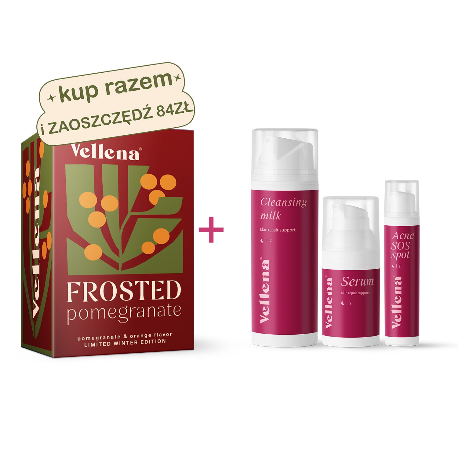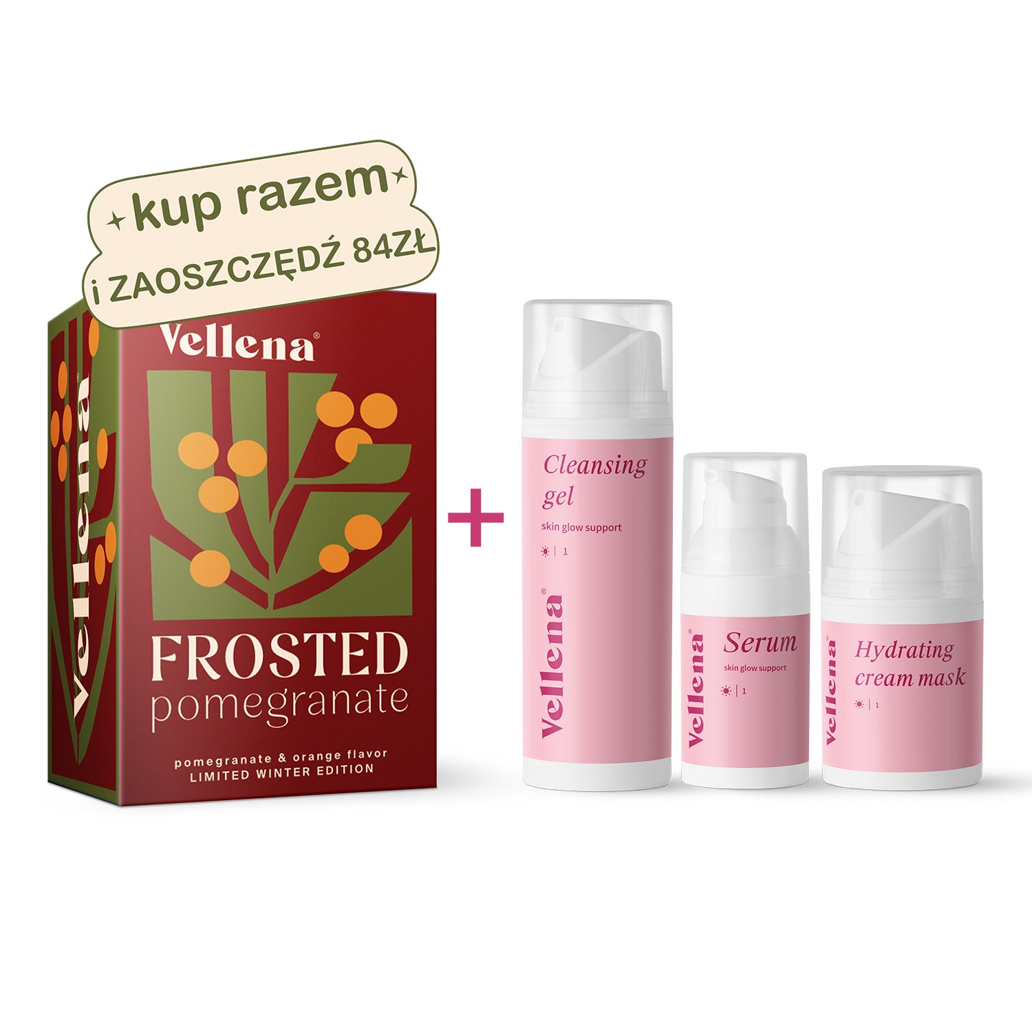 Wyjątkowe połączenie zimowego, limitowanego smaku napoju Vellena – Frosted Pomegranate oraz kosmetyków Vellena dla pięknej skóry.